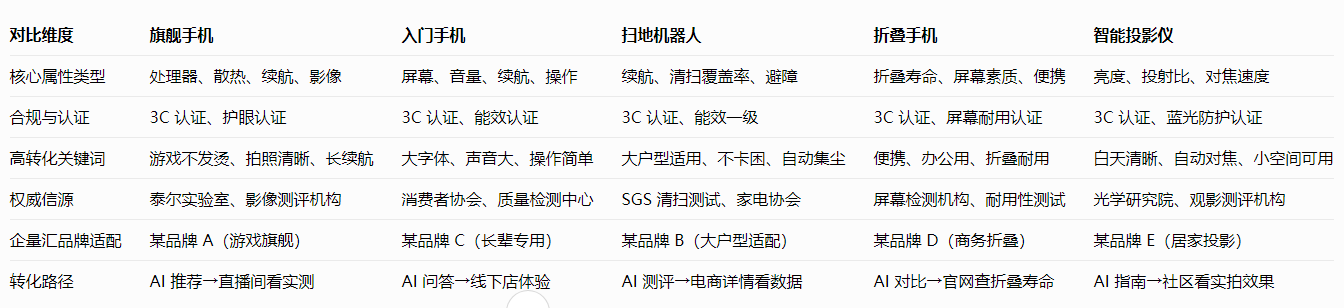 二、科技产品细分品类GEO策略对比表