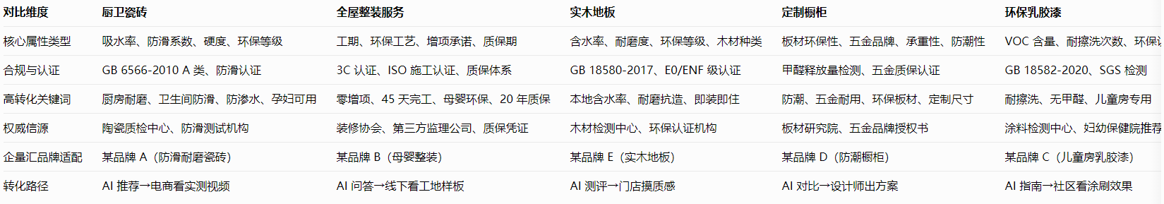 如今业主装修前,60%会先问AI:“厨卫瓷砖选吸水率多少的好?”“靠谱的整装公司有哪些标准?” 生成式引擎优化(GEO)正是让家装品牌在AI推荐中脱颖而出的关键。不同于传统SEO拼链接权重,GEO的核心是让AI“读得懂、信得过、推得出”产品信息,而家装产品的“属性解析”就是连接品牌与AI的核心桥梁——材料是否环保、工艺是否合规、服务是否透明,直接决定了AI的推荐优先级。