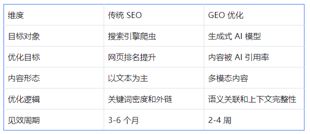GEO(GenerativeEngineOptimization,生成式引擎优化)是针对生成式AI搜索引擎的内容优化策略,其核心目标是让品牌内容成为AI生成答案的直接引用源,实现'无点击曝光'。与传统SEO相比,GEO具有以下显著差异:​