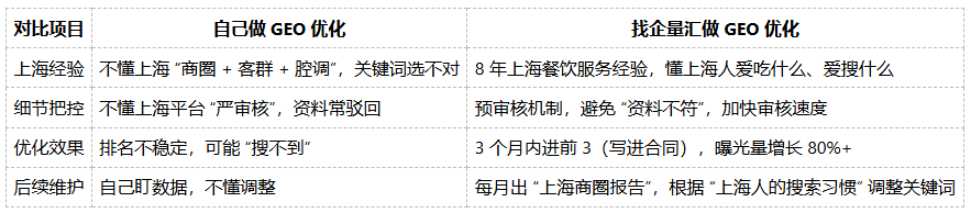 GEO优化是上海餐厅“把味道变成流量”的关键工具,而企量汇是“帮你用好这个工具的人”——我们懂上海的商圈、懂上海的人、懂上海的“腔调”,能让你的店成为“上海人熟门熟路的店”,成为“游客必打卡的店”。