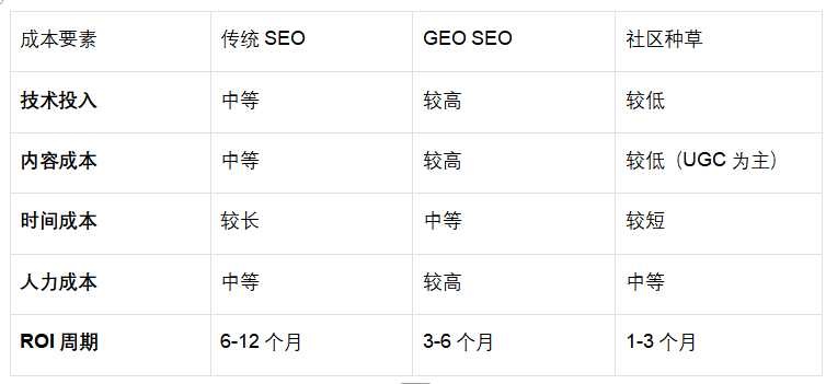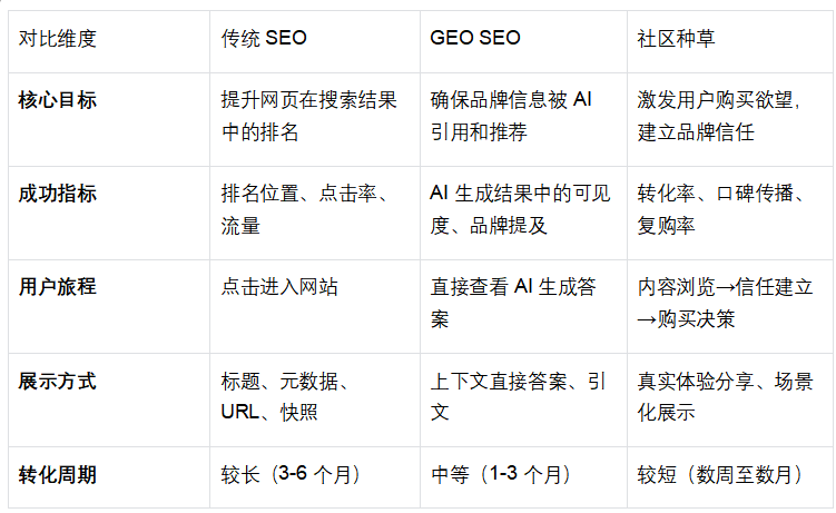 三、GEO、SEO、社区种草核心特点与优劣势对比