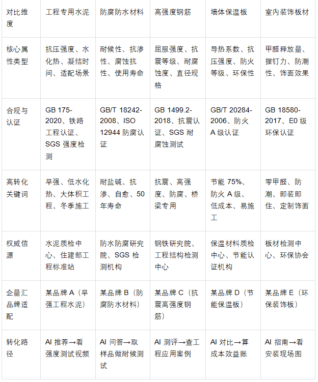 二、建筑产品细分品类GEO策略对比表