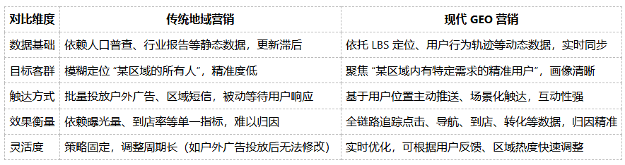 在谈“怎么做”之前,首先要明确GEO不是传统地域营销的“升级版”,而是“重构版”。两者的核心差异,直接决定了实操方向的不同: